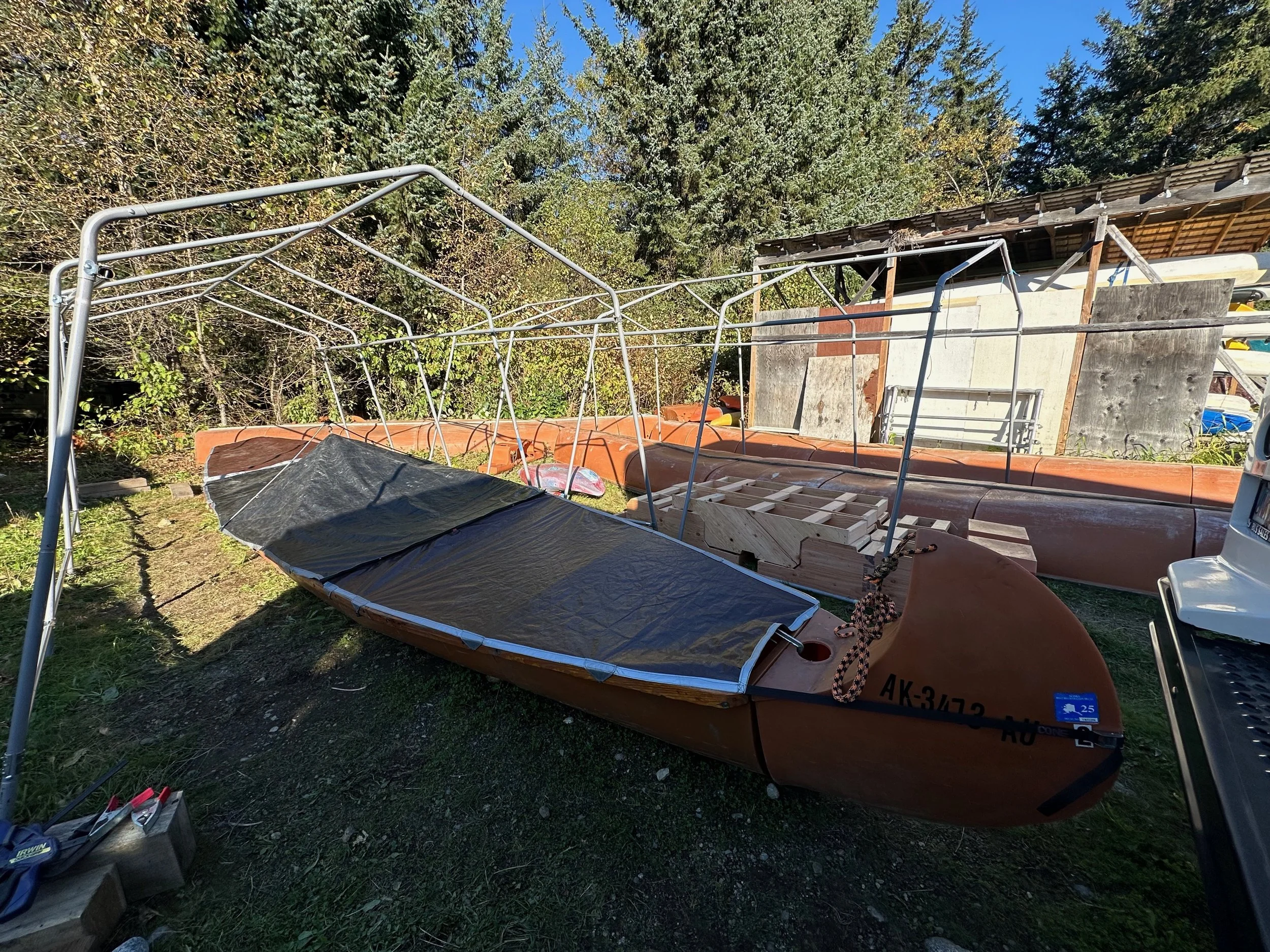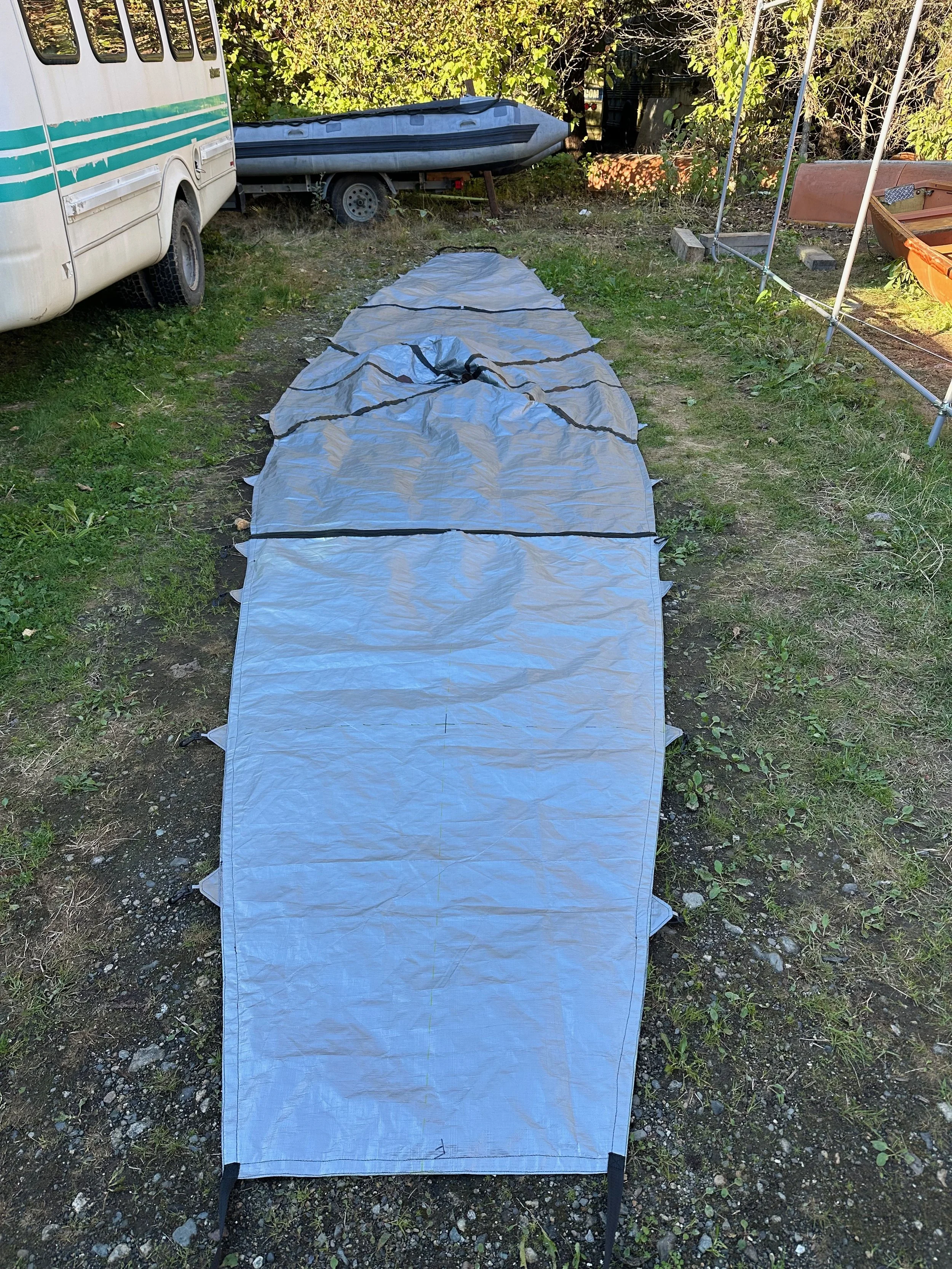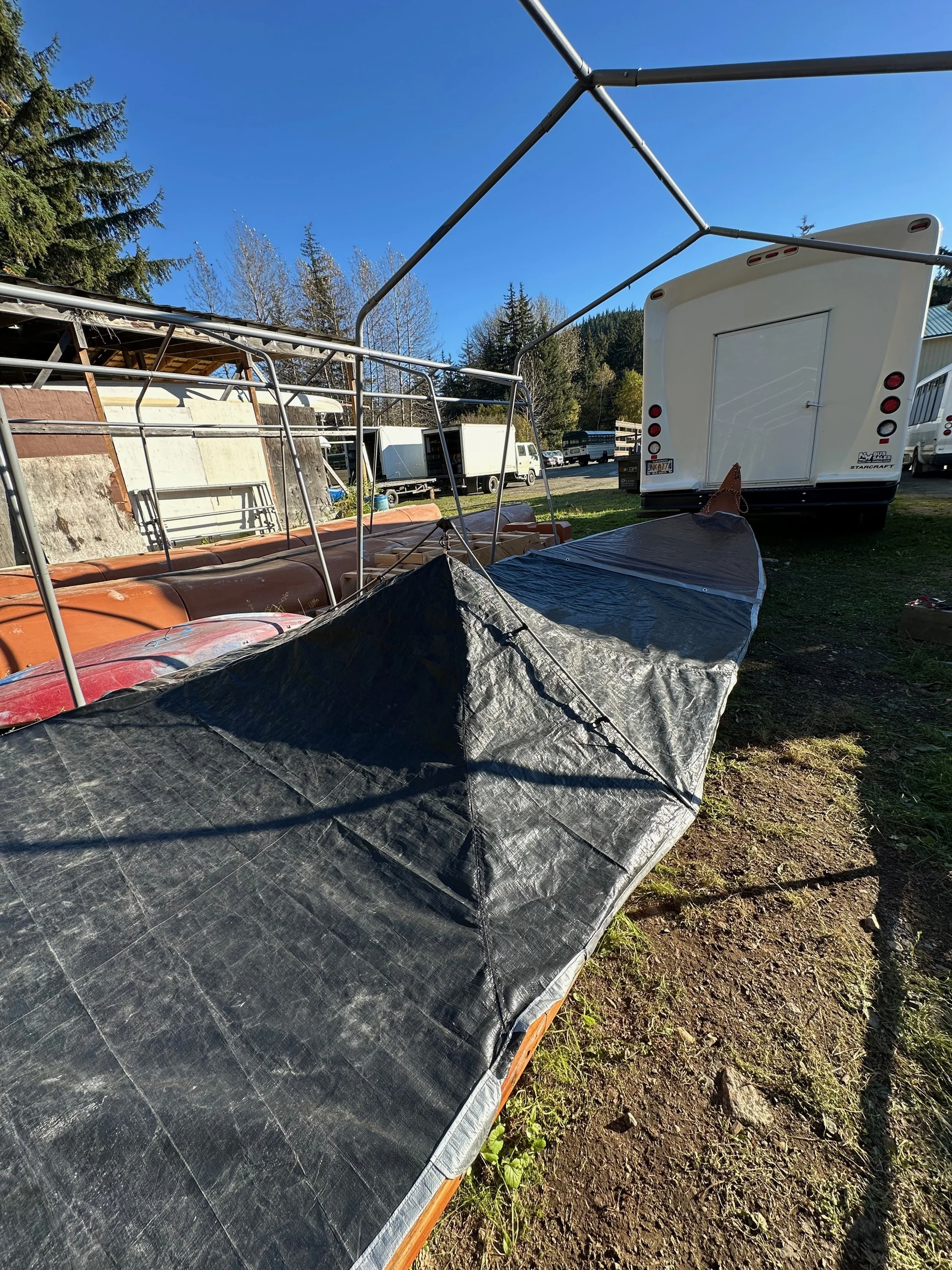 During the previous summer, I had the opportunity to design and construct a custom cover for a 30-foot canoe. The cover was created for Alaska Mountain Guides in Haines, Alaska, where I had the pleasure of working during the summer of 2025. The design features three separate removable sections, each engineered to prevent rain from entering the canoe’s compartments. The cover was constructed using heavy-duty tarp material and repurposed tent poles and fasteners.The project was completed within one week using a 1970s Singer home sewing machine.