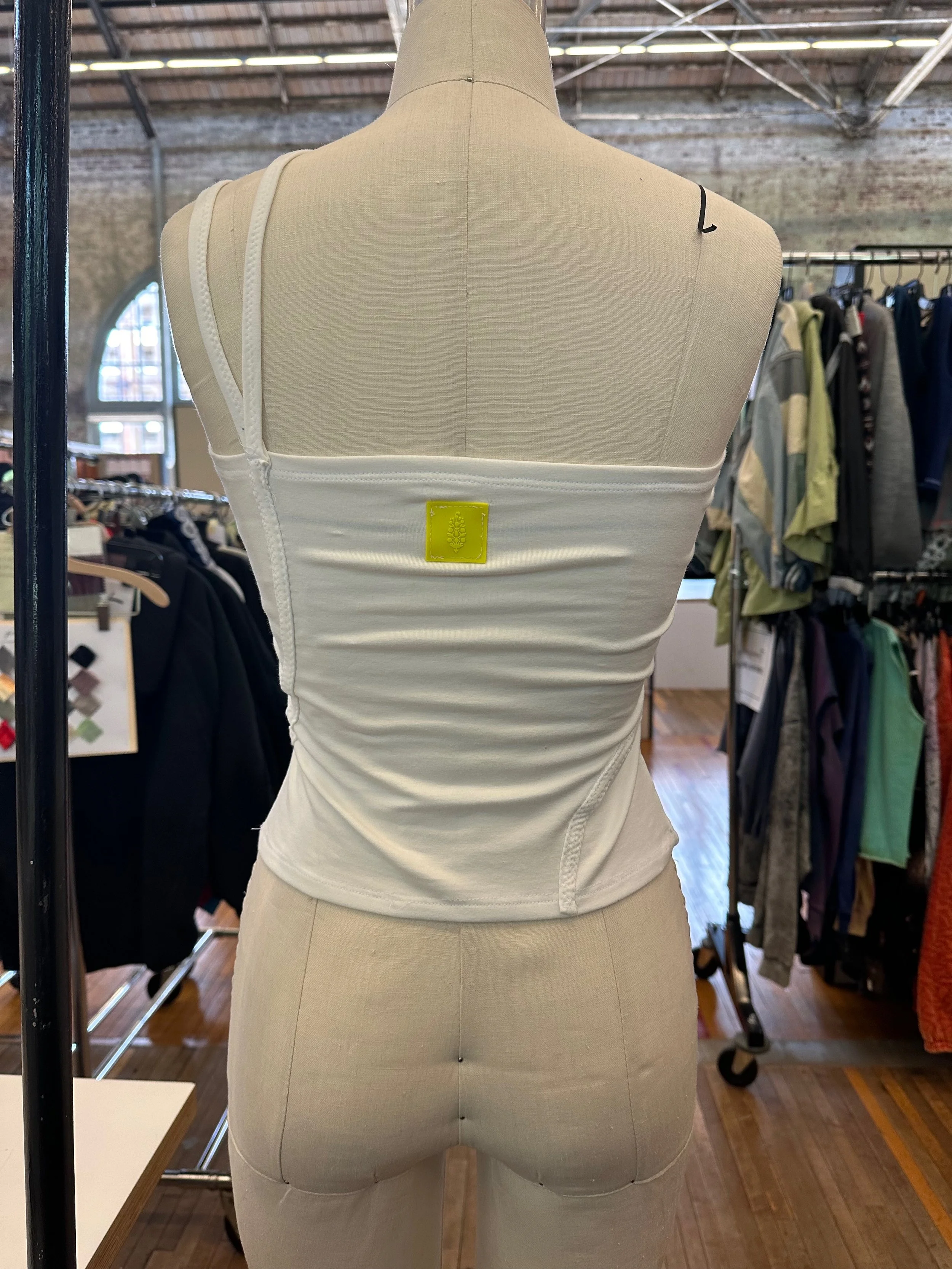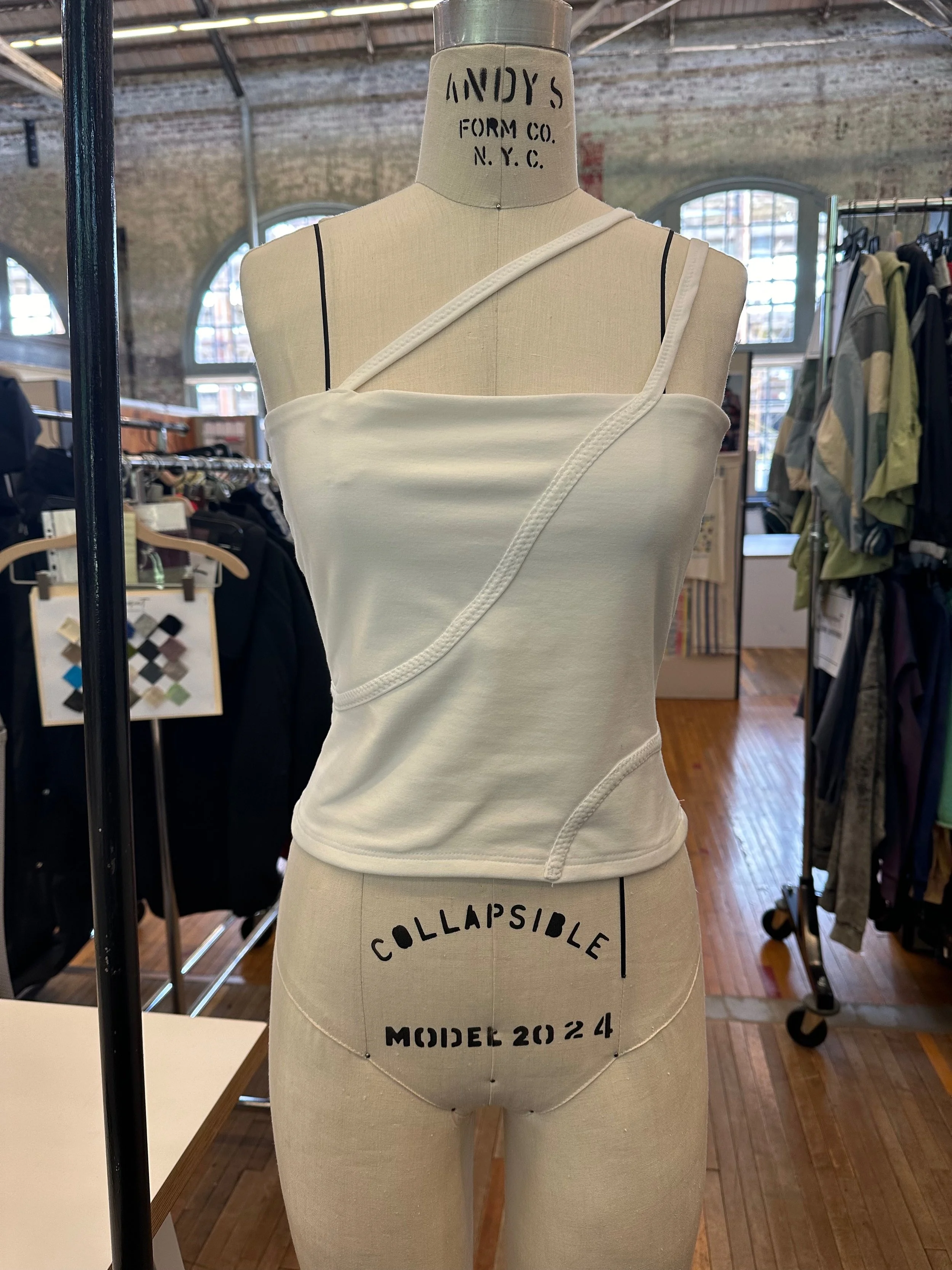 A standout piece from the collection is the Play Ball Tank, a design inspired by the curved seam lines of a tennis ball. The piece was adopted into FP Movement’s Spring 2025 line plan—an uncommon achievement for intern work—and was subsequently produced and sold online in both white and navy.
